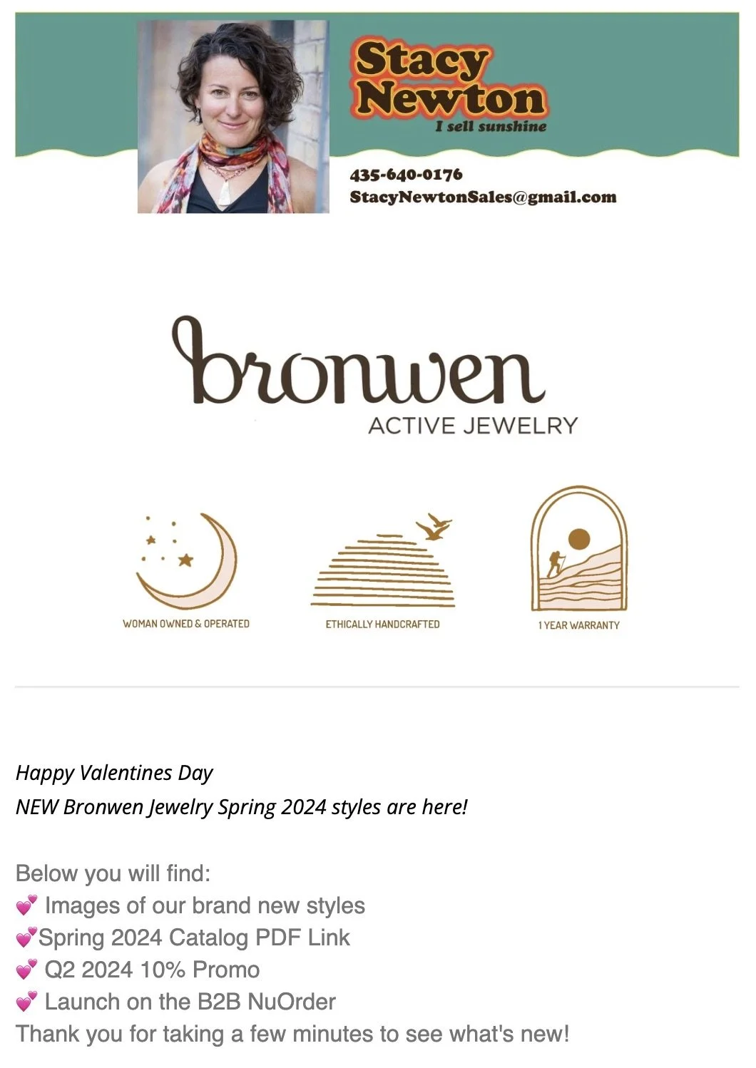 Bronwen Jewelry Spring 2024 Newsletter Feb 13 Written By Snowdrop Creative Read the full Bronwen Jewelry Spring 2024 newsletter here! Bronwen Spring 2024 Newsletter Sign up for my newsletters to stay up to date! * indicates required First Name *Email Address * /* real people should not fill this in and expect good things - do not remove this or risk form bot signups */ NewsletterBronwen Snowdrop Creative https://www.snowdropcreative.com