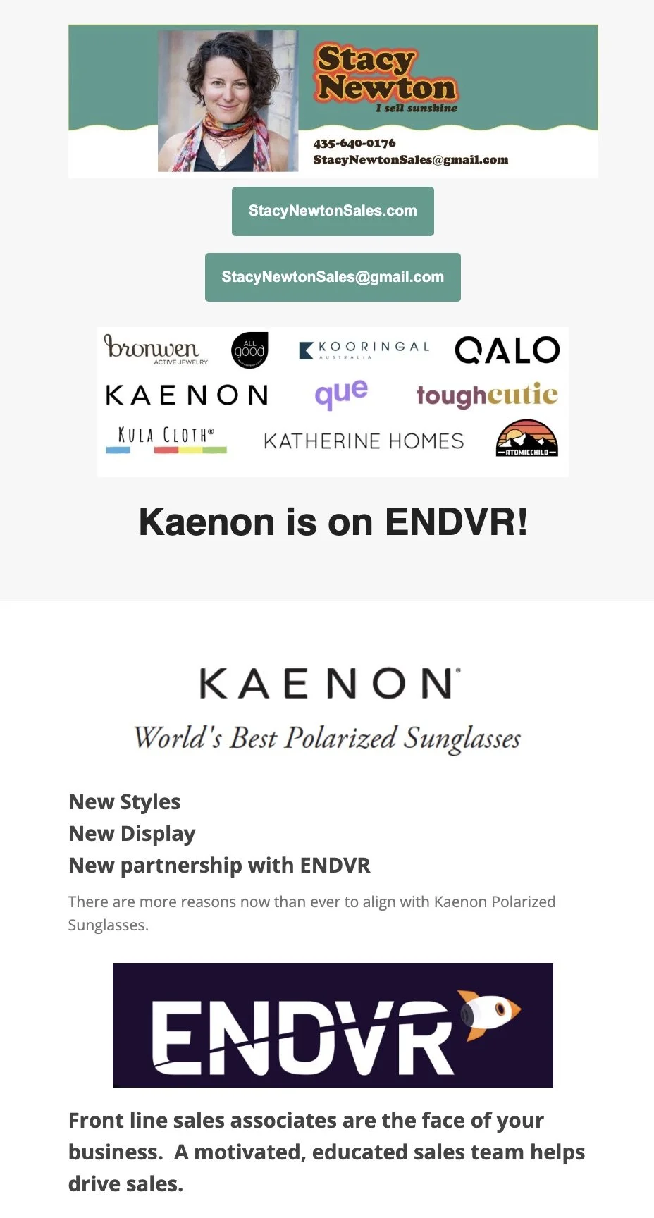 Kaenon is on ENDVR! Newsletter Jun 11 Written By Stacy Newton Read the full newsletter here! Read the Kaenon Sunglasses is now on ENDVR Newsletter! Sign up for my newsletters to stay up to date! * indicates required First Name *Email Address * /* real people should not fill this in and expect good things - do not remove this or risk form bot signups */ NewsletterKaenon Stacy Newton